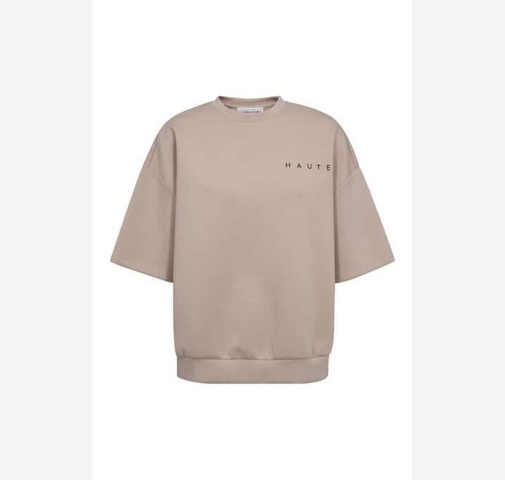 DESCRIPTION: Beige sweatshirt from Haute L’Amitié with a black HAUTE logo on the front. The sweatshirt has an oversized fit and short sleeves.