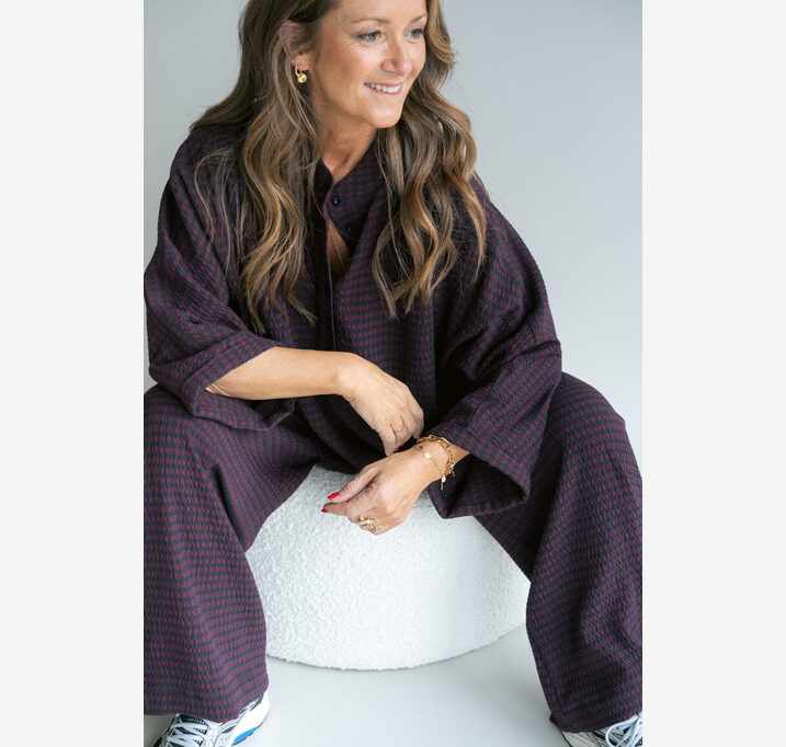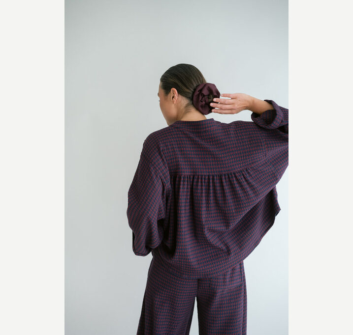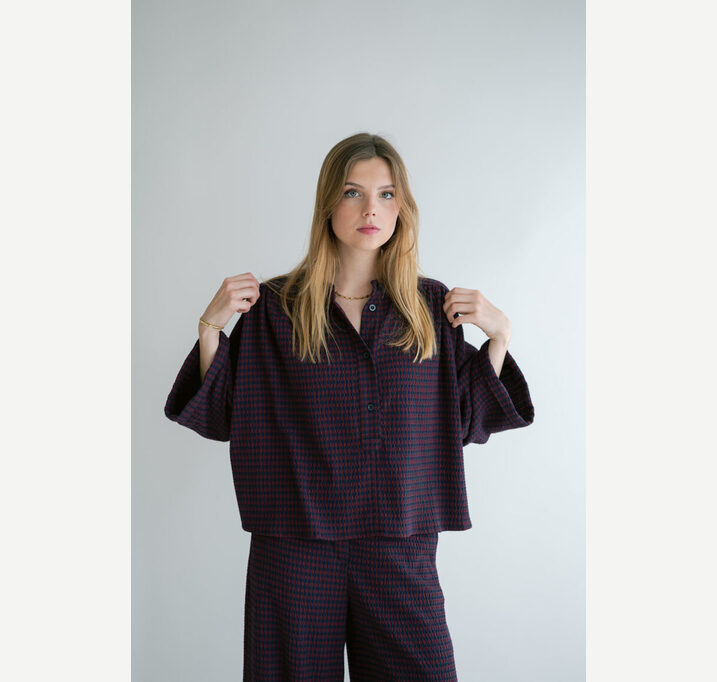 DESCRIPTION: This Maya blouse features a flat collar, wide sleeves, and a beautiful back, a perfect match with our Sam trousers or Juliette skirt in the same check. This fabric is also incredibly comfortable and wrinkle-resistant!