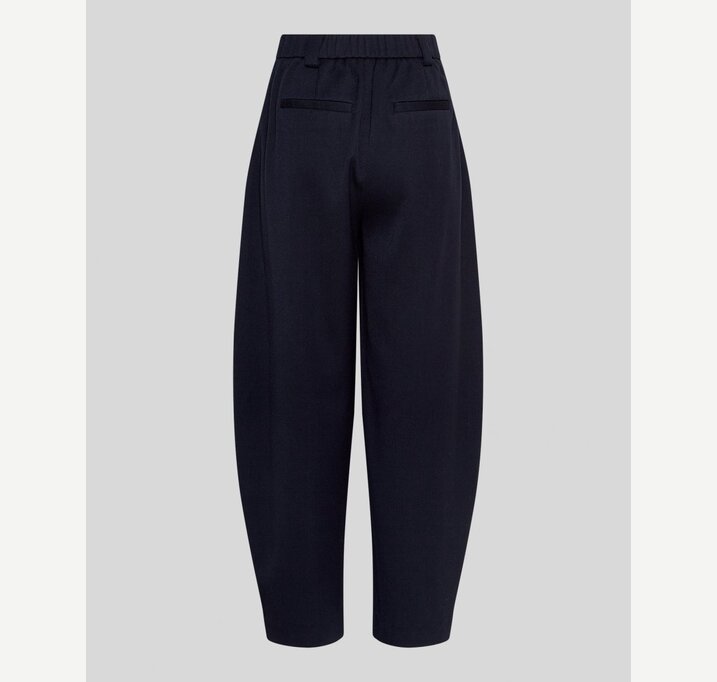 DESCRIPTION: The MSCHMynthe Elina HW Pants are your go-to tailored trousers with a twist. Designed with a flattering high waist and a modern barrel-leg silhouette, these trousers blend classic tailoring with contemporary edge. The crisp pleats and structured fabric offer a clean look, while the elastic waistband at the back ensures all-day comfort. Style with a tucked-in shirt for the office or a cropped tee for effortless off-duty elegance.