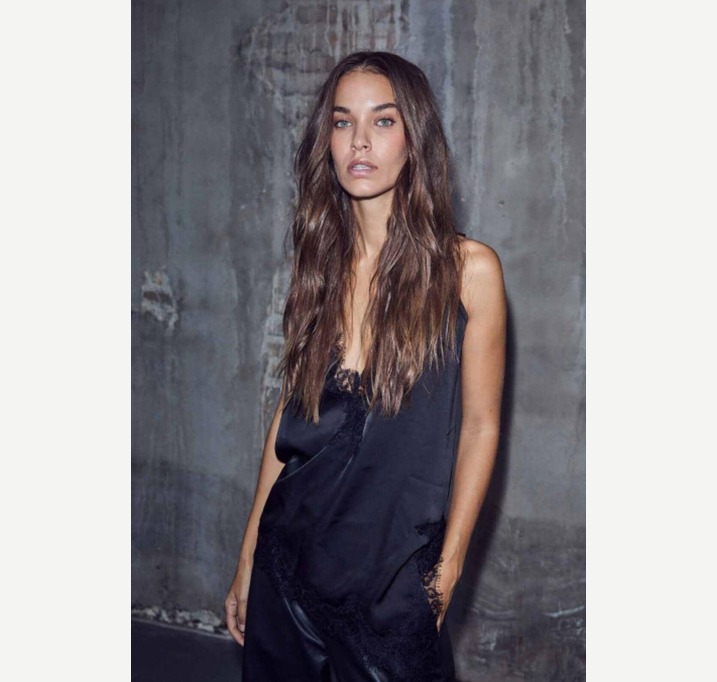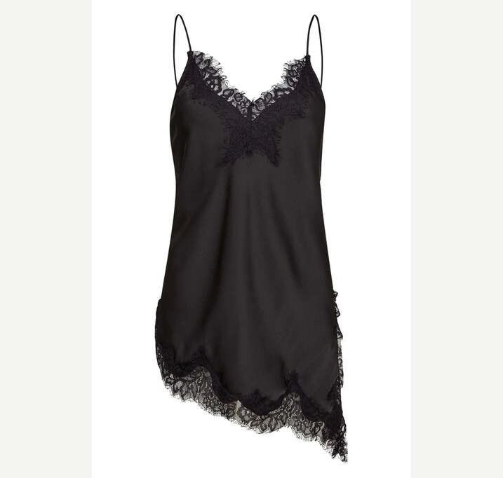 DESCRIPTION: Black lingerie top from Haute L’Amitié with lace details at the V-neck. The top features thin straps and an asymmetrical lace hem.