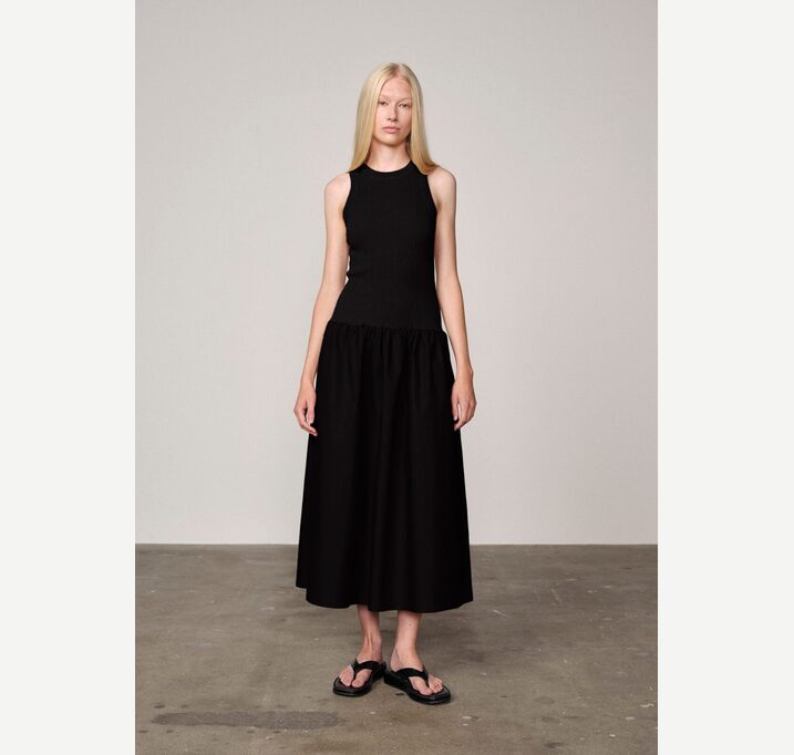 DESCRIPTION: A hybrid dress combining a rib-knit top with a crisp cotton poplin skirt. The contrast between the soft, fitted knit and structured cotton creates a refined yet effortless silhouette — modern, feminine and versatile.