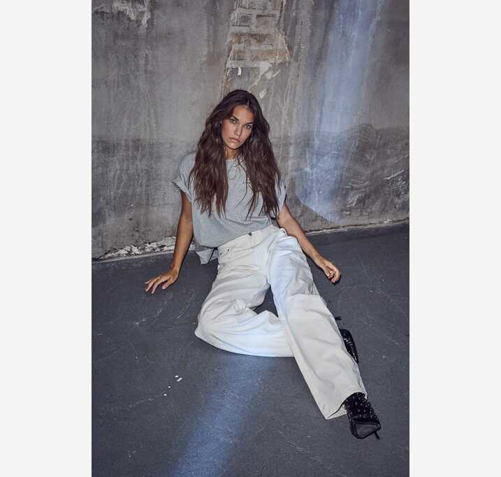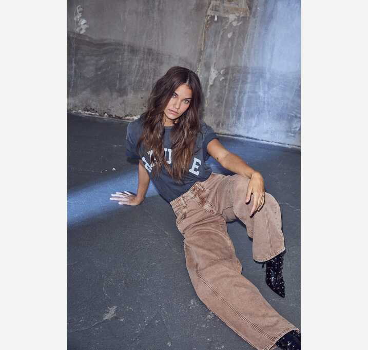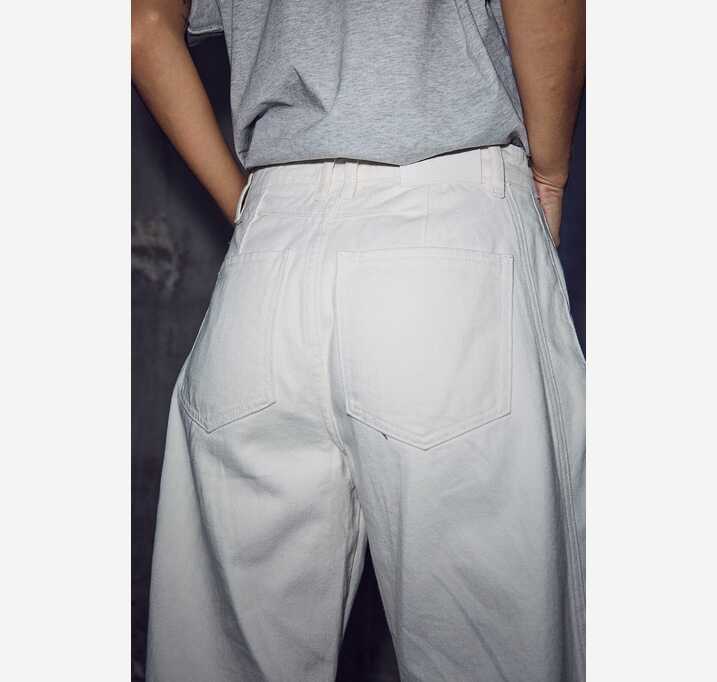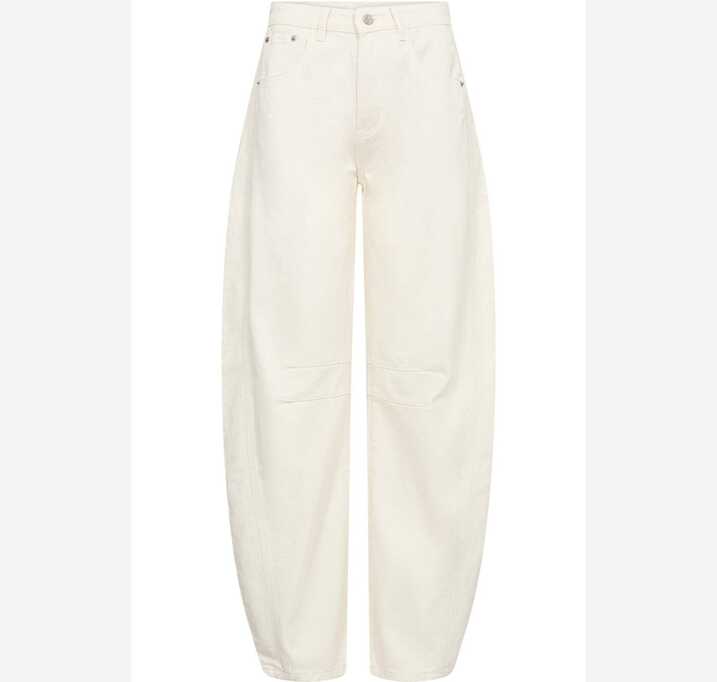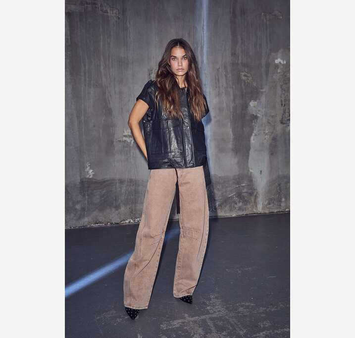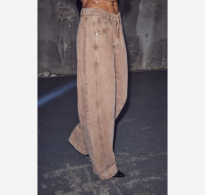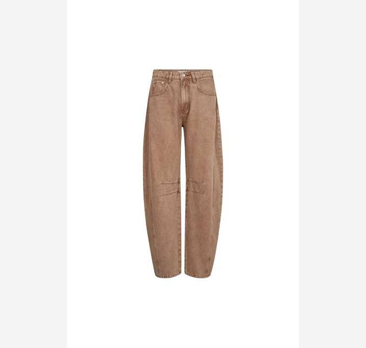 DESCRIPTION: Haute L’Amitié jeans in camel-colored cotton and polyester. The jeans have a high waist and a relaxed fit with decorative stitching at the knees.