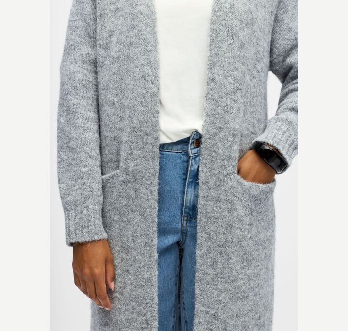 DESCRIPTION: Long knitted cardigan – Open front – Raglan shoulders – Long sleeves – Ribbed trims –