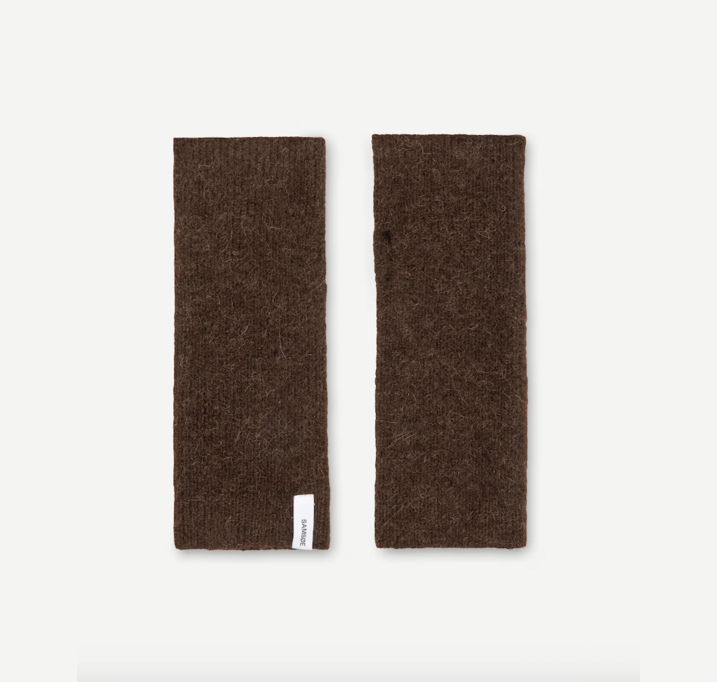 DESCRIPTION: Knitted arm-warmers with a thumb hole. Samsøe Samsøe logo label on the cuff. Main material made from an elastic blend of wool, alpaca wool, and recycled polyester. This product is RWS certified. The RWS describes and certifies animal welfare and land management practices in wool fibre production and tracks the certified material from farm to final product.