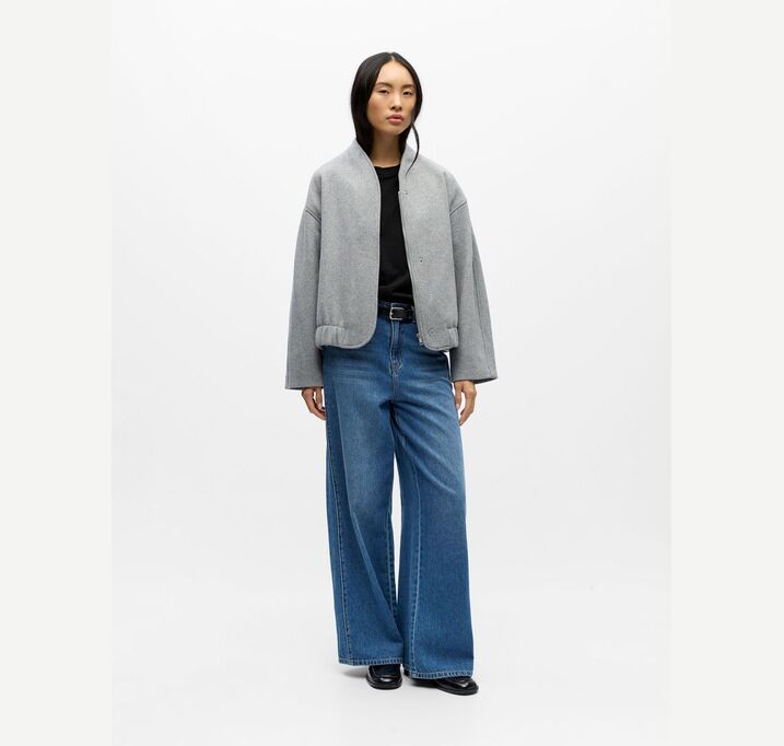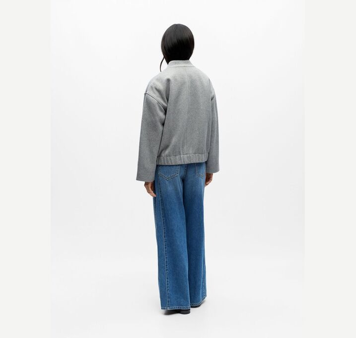 DESCRIPTION: Wool blend bomber jacket – Bomber collar – Dropped shoulders – Long sleeves – Welt pockets – Concealed zip-up front – Elasticated hemline – Loose fit