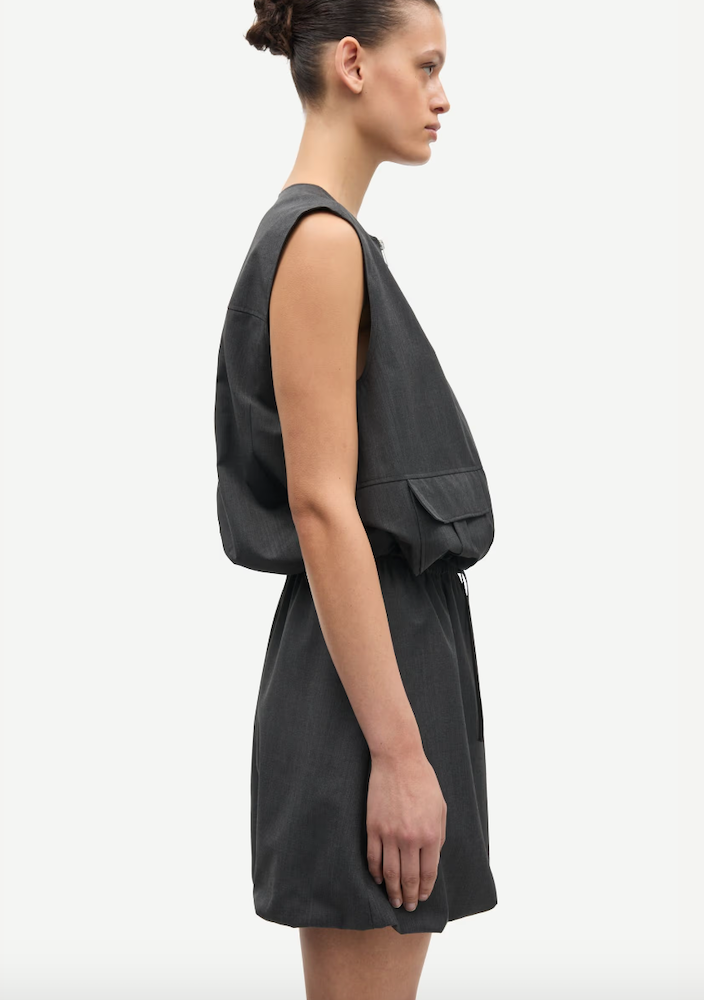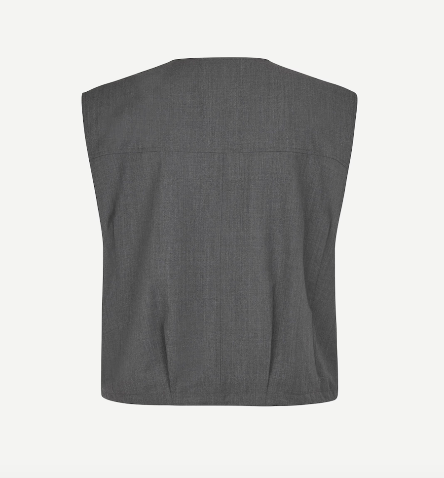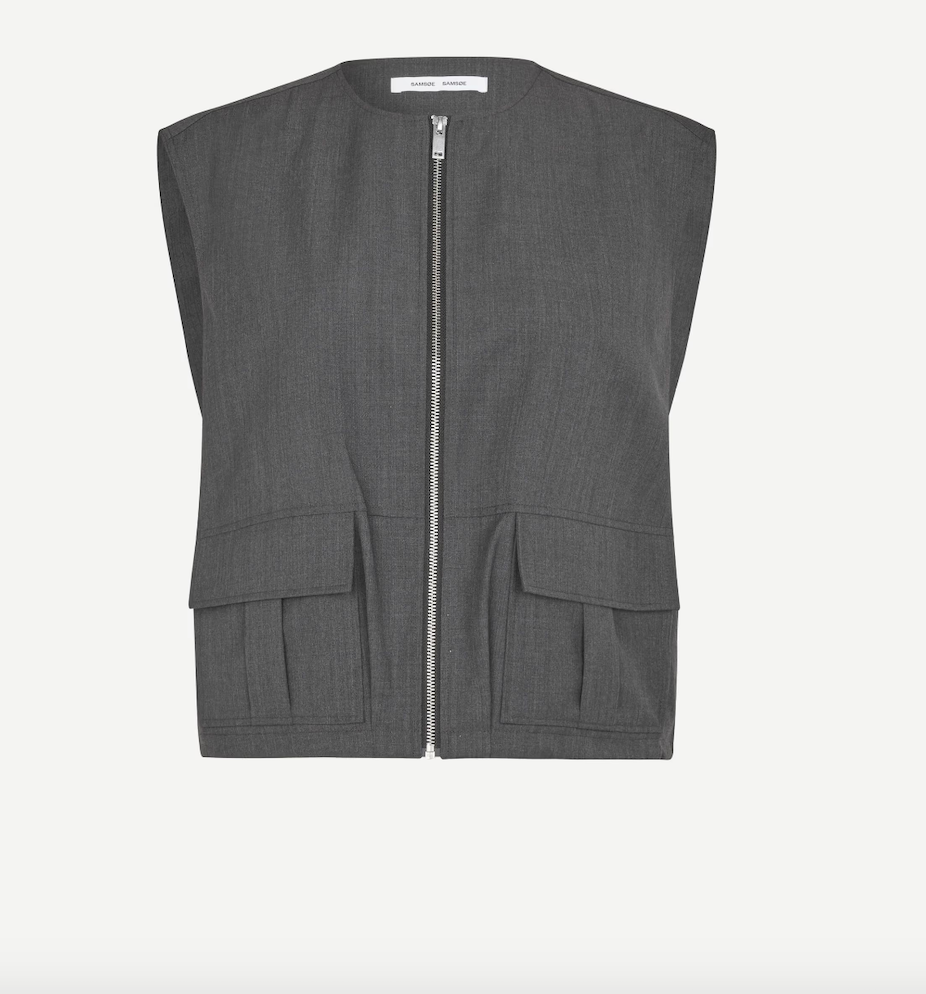 DESCRIPTION: Vest with an oversized fit. Zipper closure on the front. Patch pockets with flaps on the front. Drawstring at the bottom hem. Main lining made from [desirable material/blend]/Fully lined. Main material made from a wool-blend.