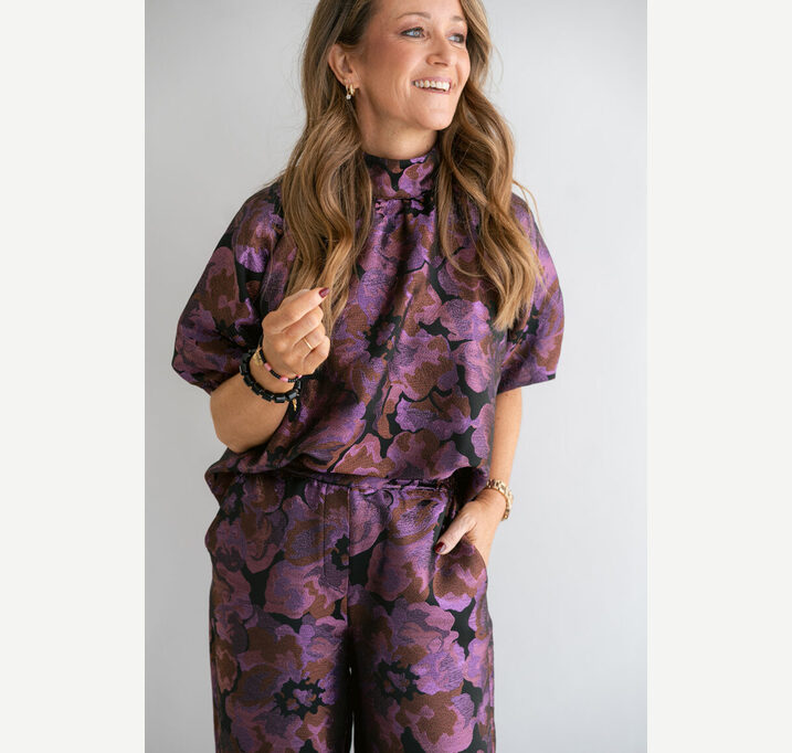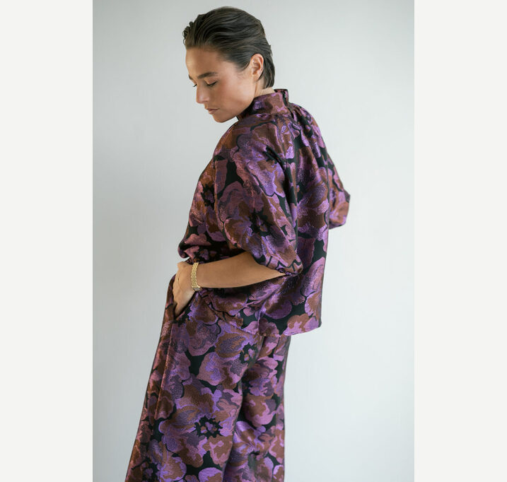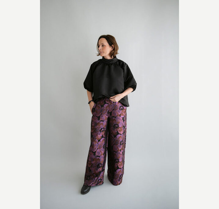 DESCRIPTION: Wide-leg trousers in a woven jacquard fabric with a shimmering detail. These Sam trousers have an elasticated back waistband for a beautiful, snug fit. Pair beautifully with the matching Mabel blouse for a festive look.