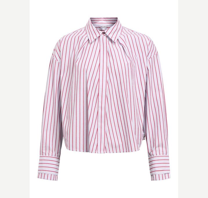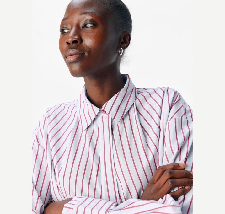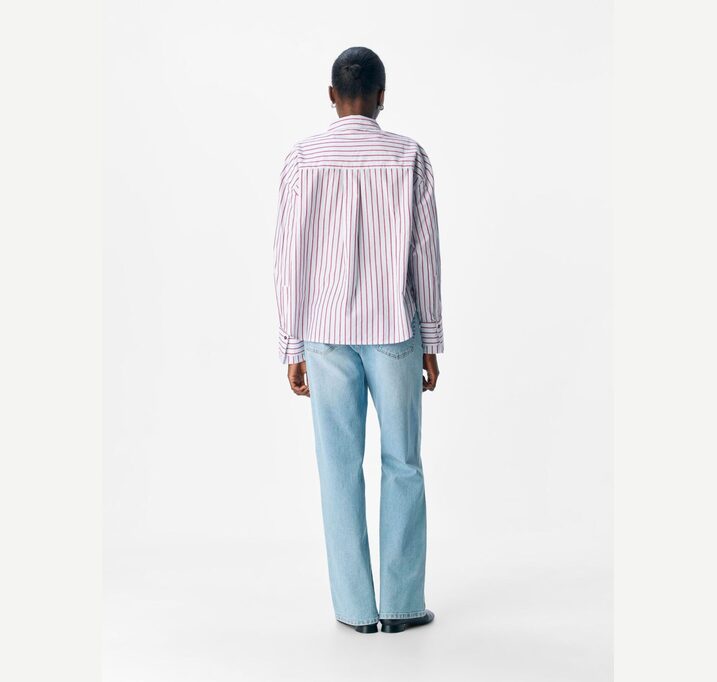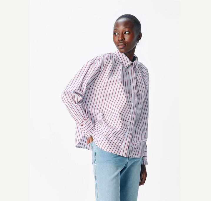 DESCRIPTION: Striped long sleeved shirt – Pointed collar – Dropped shoulders – Buttoned cuffs – Front pleat details – Button-up front concealed by placket – Curved hem – Regular fit