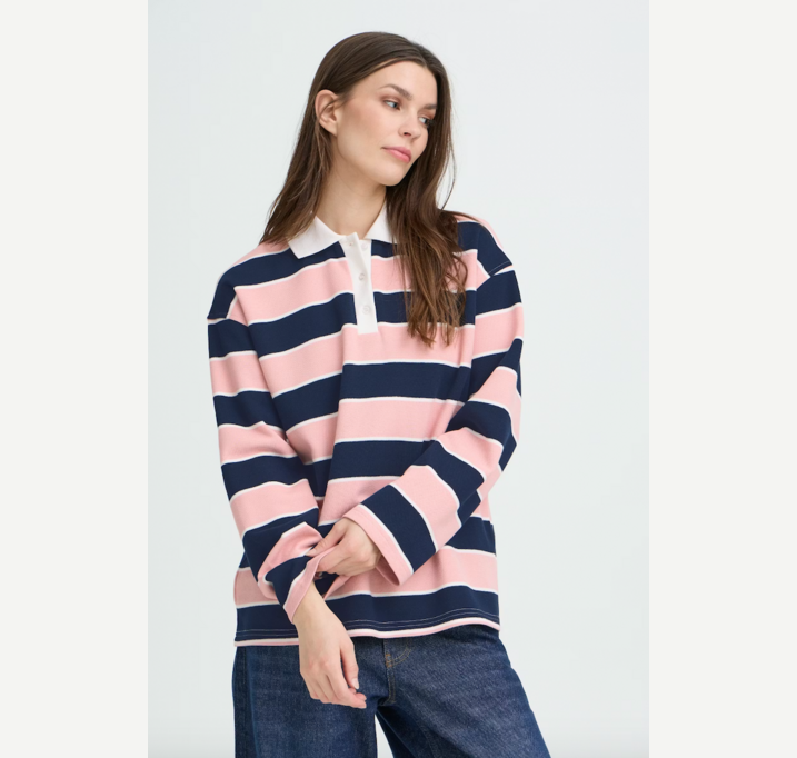 DESCRIPTION: This striped long sleeve rugby shirt features bold horizontal bands, a classic white collar, and a structured button placket. Relaxed, straight fit with ribbed cuffs for a sporty, confident statement.
