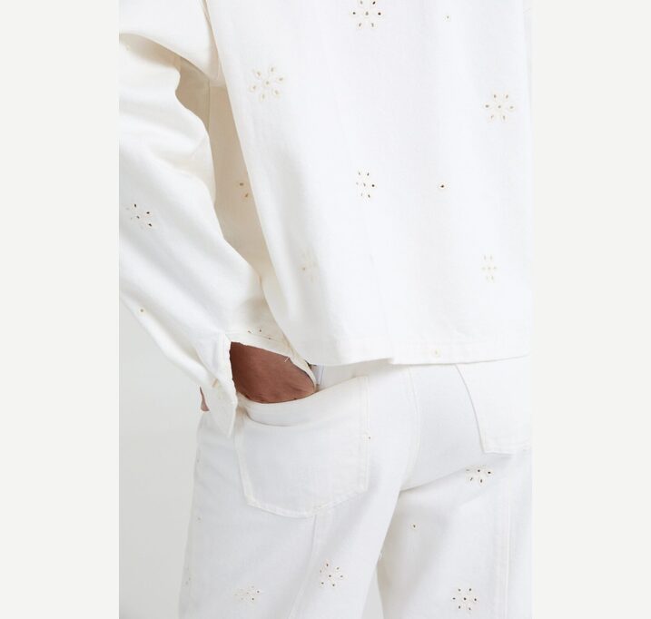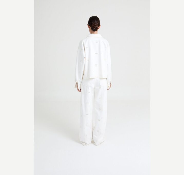 DESCRIPTION: Wide-leg embroidered pants featuring a front stitch and a relaxed silhouette for an elevated yet effortless fit.