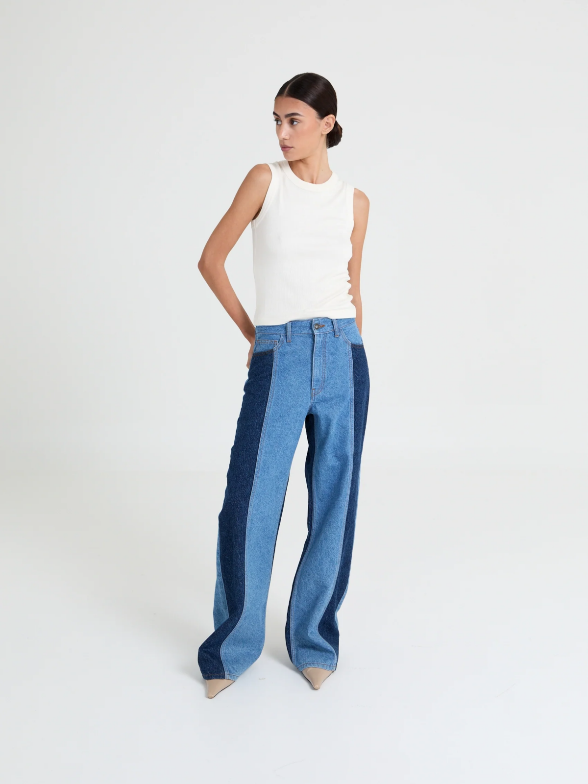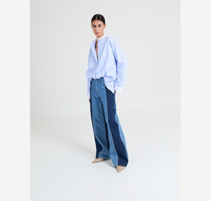 DESCRIPTION: The Joey Jeans two colors is a wo-tone wide-leg with bold contrast panels for a modern, elongated silhouette.