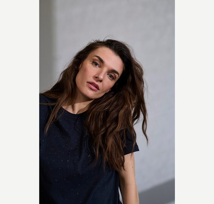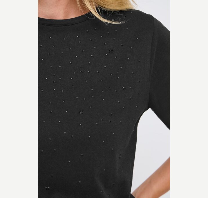 DESCRIPTION: Black t-shirt with sparkle applications.