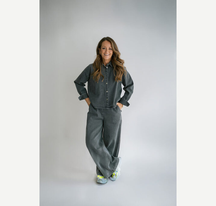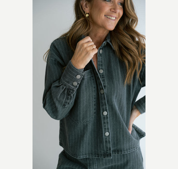 DESCRIPTION: A popular style in our collection, now in a beautiful gray denim fabric. This Maria blouse is a shorter version of the Marie blouse, creating a bolder look.