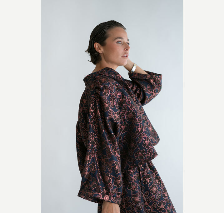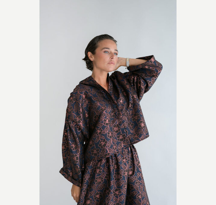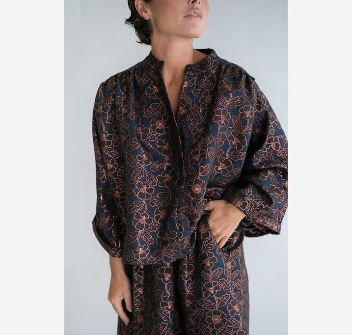 DESCRIPTION: This Maya blouse features a flat collar, wide sleeves, and a beautiful back, a perfect match with our Sam trousers or Julia skirt in the same fabric. Create the perfect party look or wear it with your favorite jeans for an everyday look.