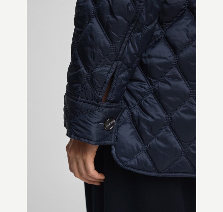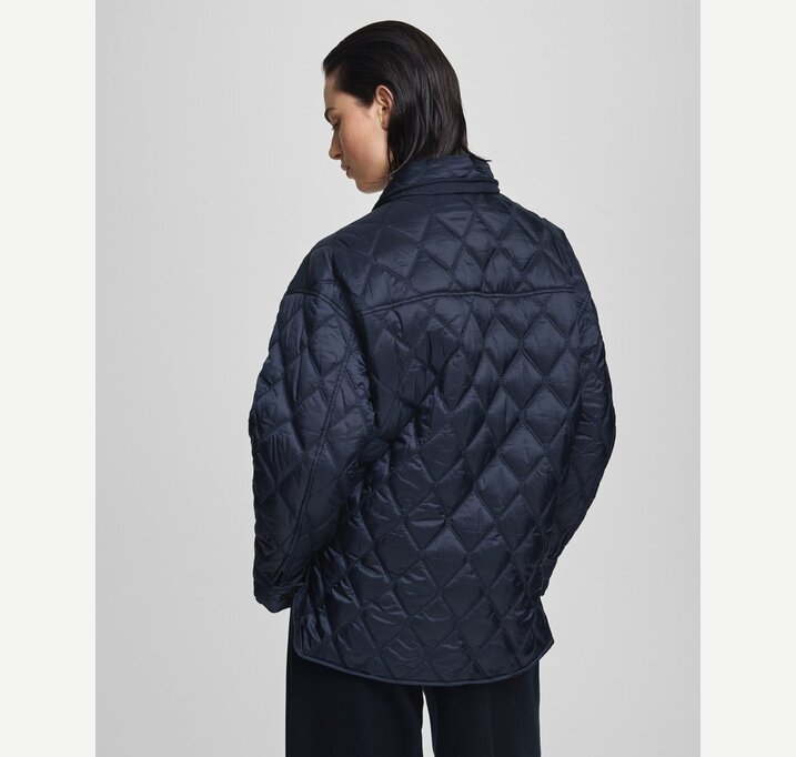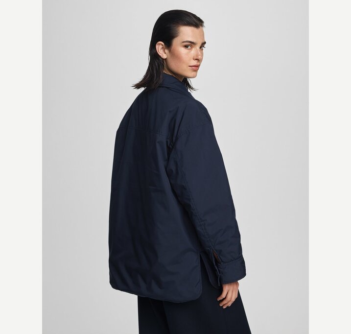 DESCRIPTION: The Melli jacket is a modern, everyday jacket. On one side it got a plain surface while the other is quilted. The jacket is reversible, so you can style it for different occasions. The colour is a deep blue nuance, which is timeless and classic. The jacket features a collar, chest pocket and button closure.