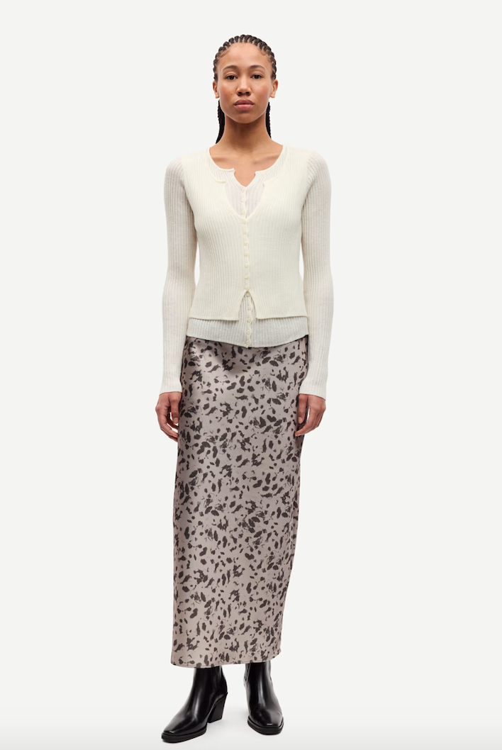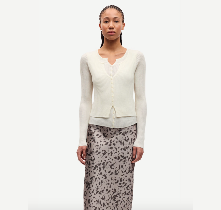 DESCRIPTION: Long-sleeved rib-knitted top with a slim fit. Double-layered at the front. Button closure on the front. Frilled detailing at the cuffs. Main material made from 100% wool. This product is RWS certified. The RWS describes and certifies animal welfare and land management practices in wool fibre production and tracks the certified material from farm to final product.
