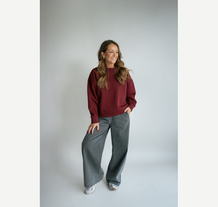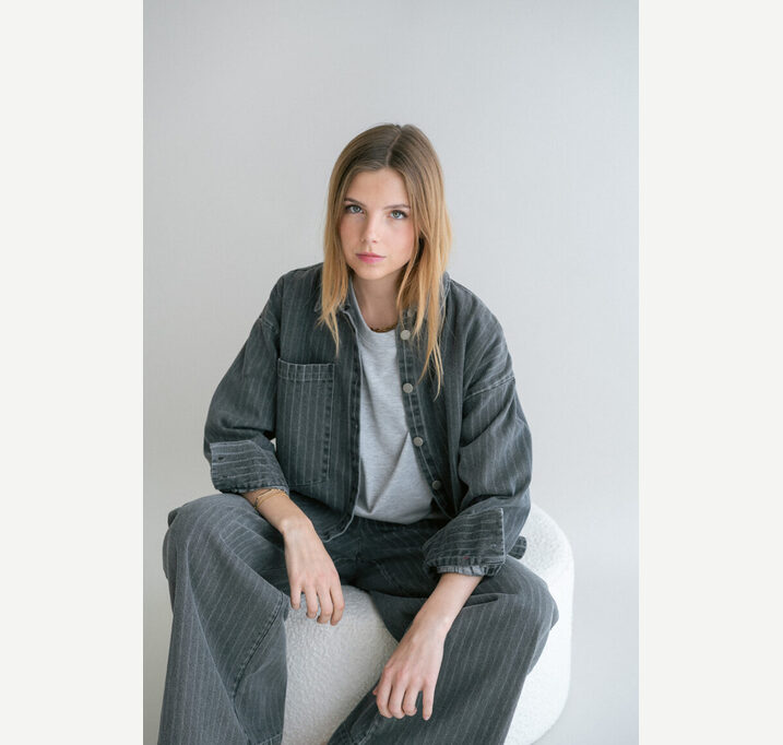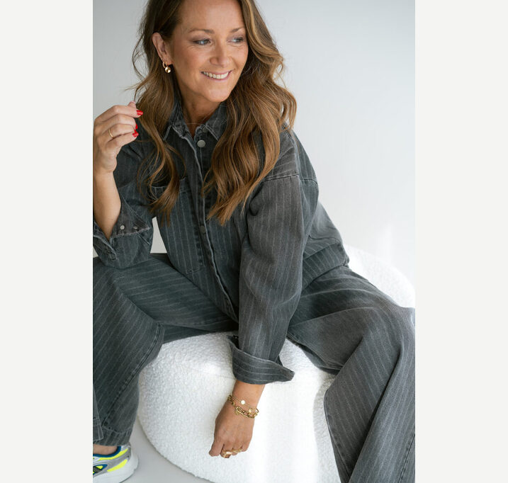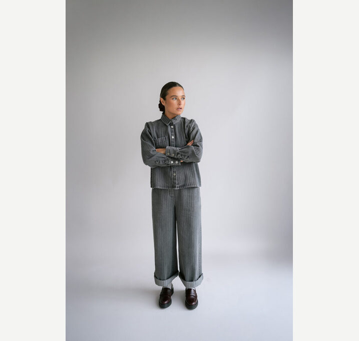 DESCRIPTION: Gray denim Sam pants. The pants have side pockets and an elasticated waistband at the back for a comfortable fit.